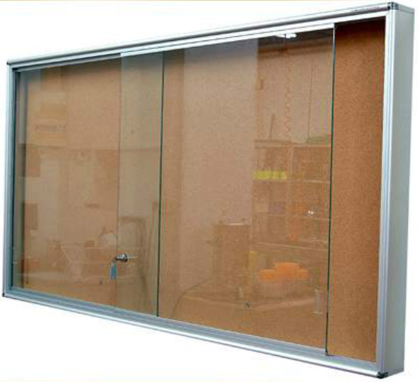 לוח מודעות - דלת הזזה מזכוכית, הלוח כולל מסגרת אלומיניום בגוון 101 ברונזה / טבעי כסוף, לוח שעם, וצילינדר לנעילה (הכולל 2 מפתחות)